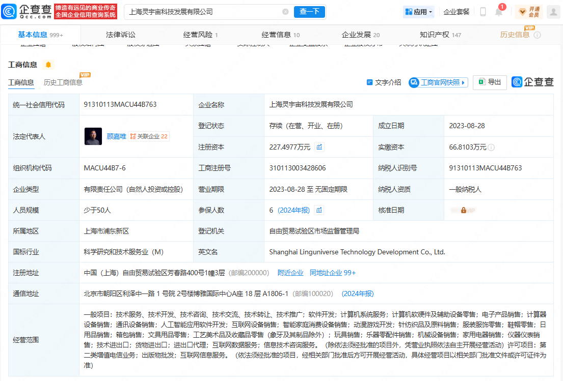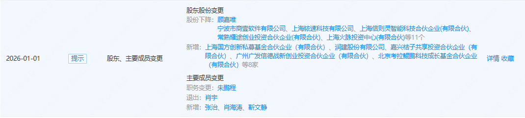 企查查APP显示,近日,上海灵宇宙科技发展有限公司发生工商变更,新增润建股份(002929.SZ)、滴滴关联公司嘉兴桔子共享投资合伙企业(有限合伙)等为股东,同时注册资本增至227.5万元。公开信息显示,灵宇宙是一家AI+消费机器人公司。