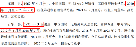 与此类似的还有另一位董事石华,这位1971年出生的人士,公开披露的第一个职业就是2012年担任维通利的销售经理,此时的石华也年届41周岁了。